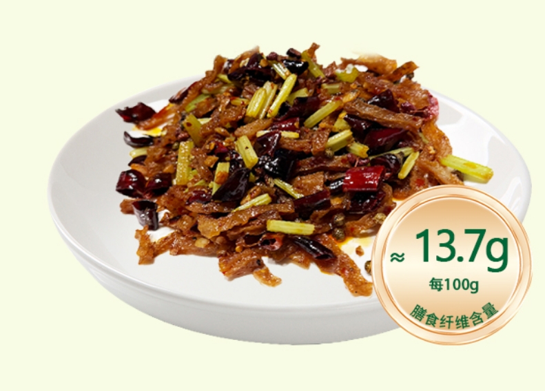 每100g膳食纖維含量在13.7g脫水後嚼勁十足,可泡發(fā)烹飪或直接調(diào)味食用,耐儲(chǔ)存,追劇、代餐小零嘴